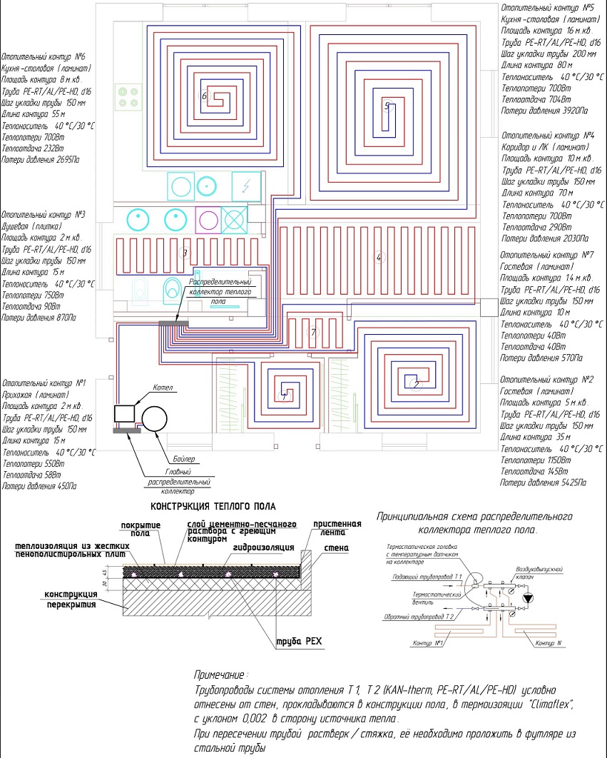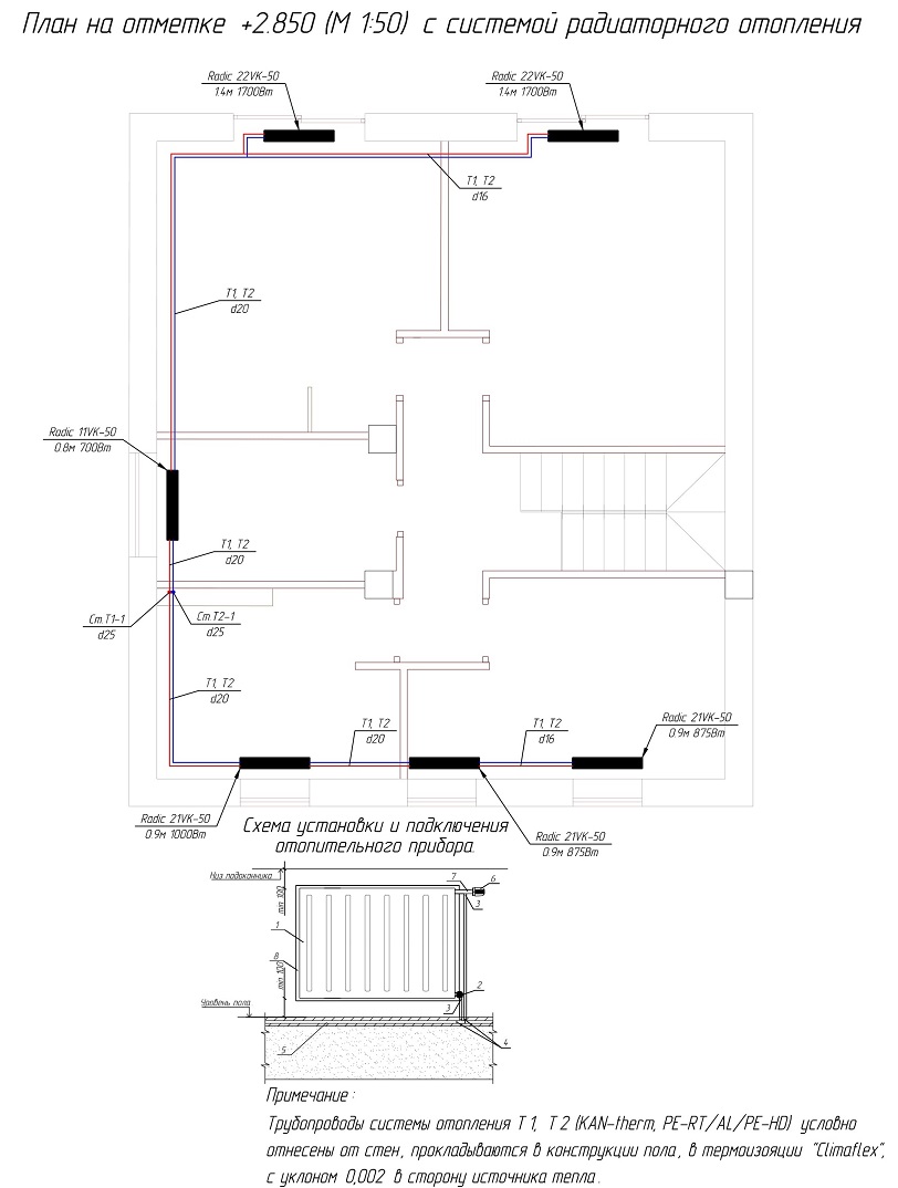В проекте должна быть схема системы отопления и детальные схемы её участков.