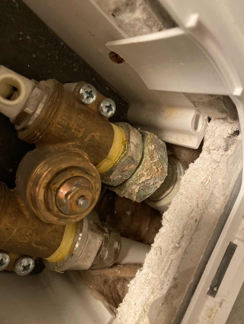 Судя по налету можно предположить что узел подключен к ГВС (КАТЕГОРИЧЕСКИ ЗАПРЕЩЕНО); с герметичностью в подключении данного узла есть проблемы.