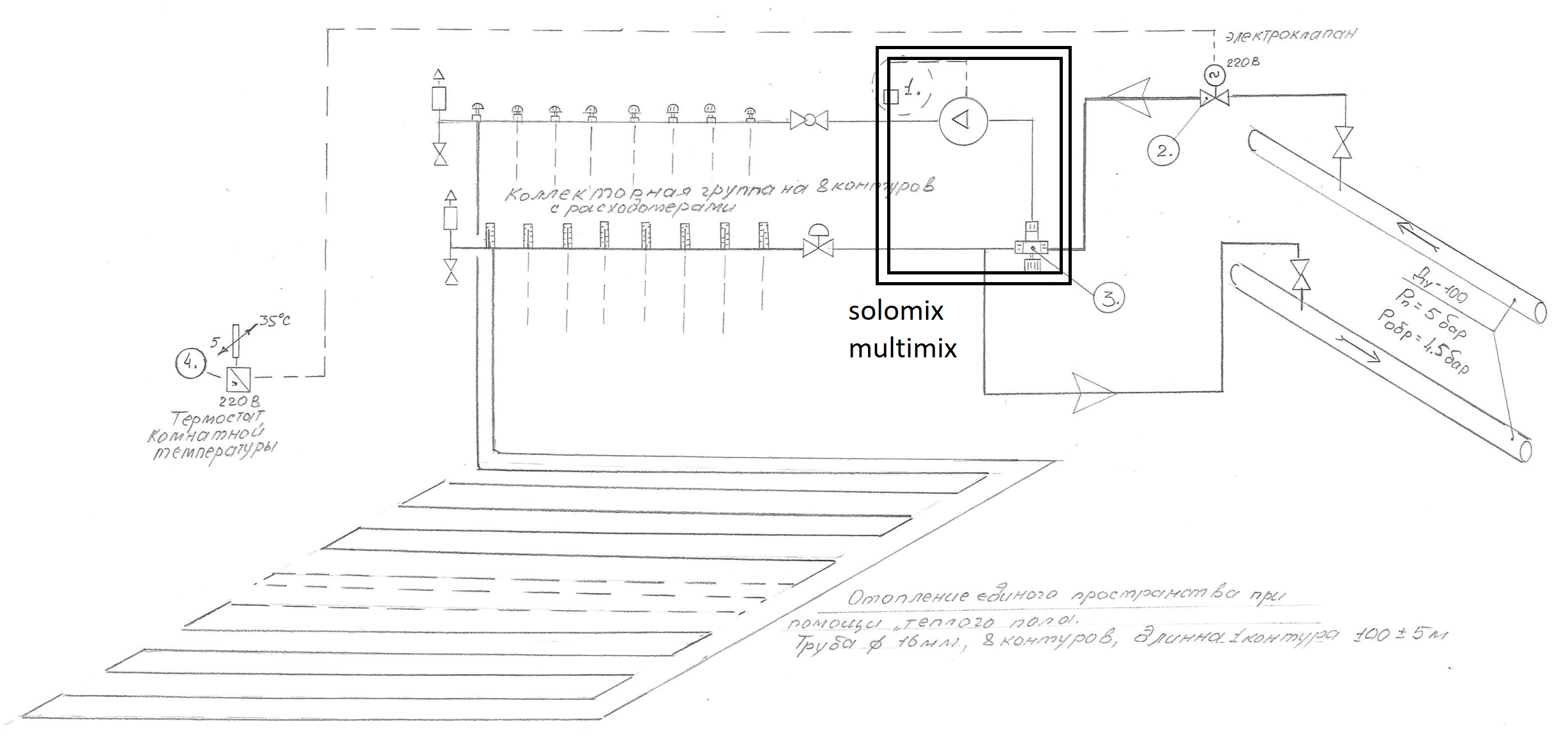Ставите коллекторную группу, подключаете её к насосно-смесительным группам. В качестве поз.2 можно использовать кран, комнатные термостаты тоже есть