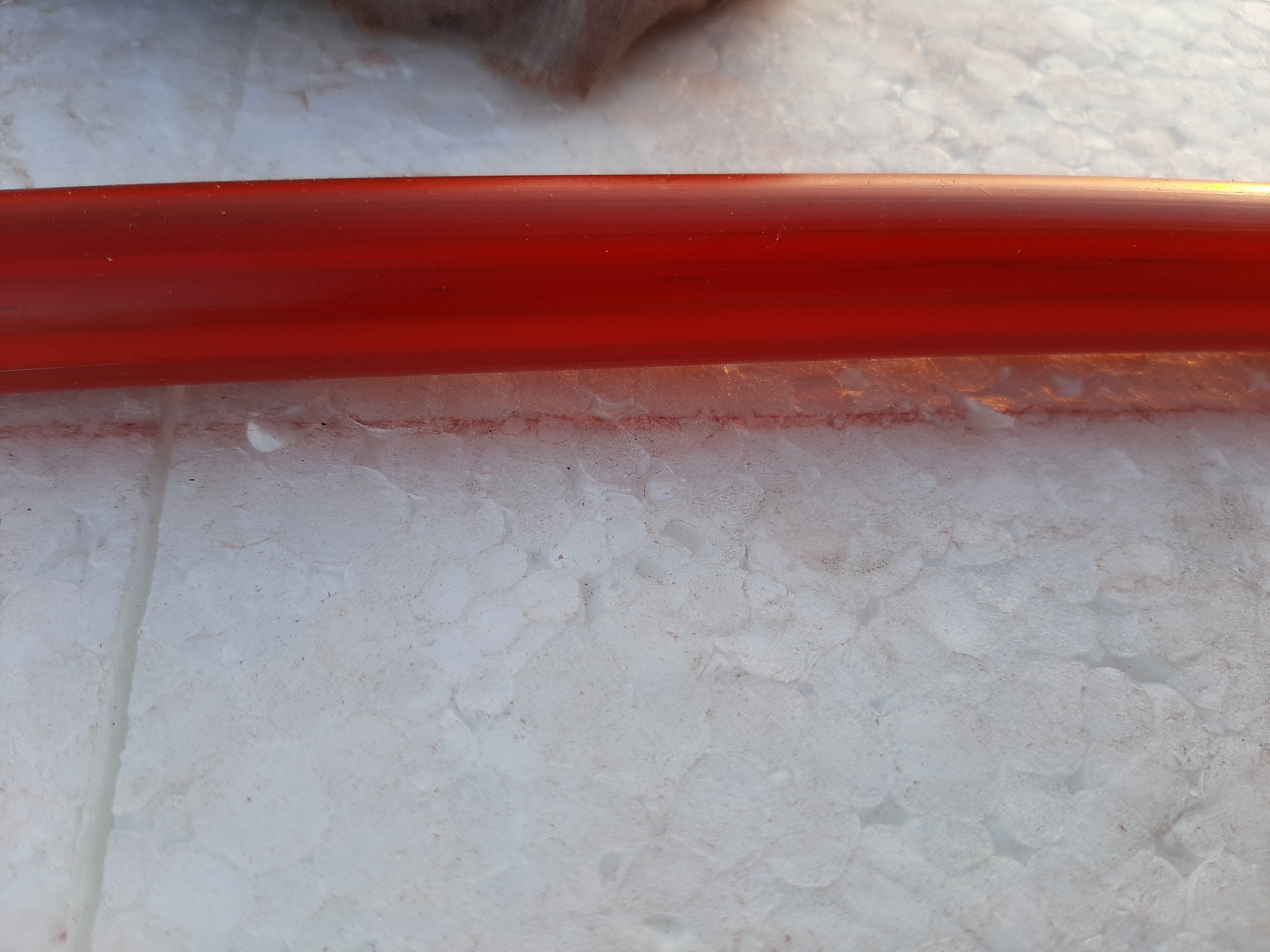 Здравствуйте. Приобрел pert трубу производства Чехия. В середине бухты имеется участок трубы странного цвета с полосами. Скажите, как получились эти полосы и является ли это браком?