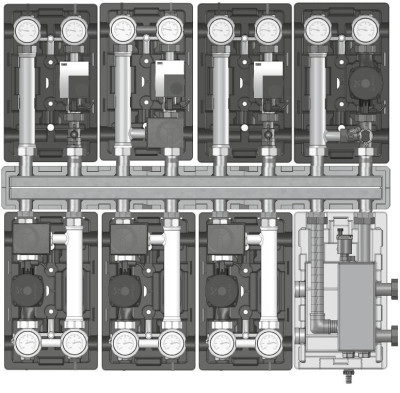 Максимальное количество насосных групп, которые можно подключить к коллектору - 6 шт - четыре "правых" сверху и две "левых" снизу: