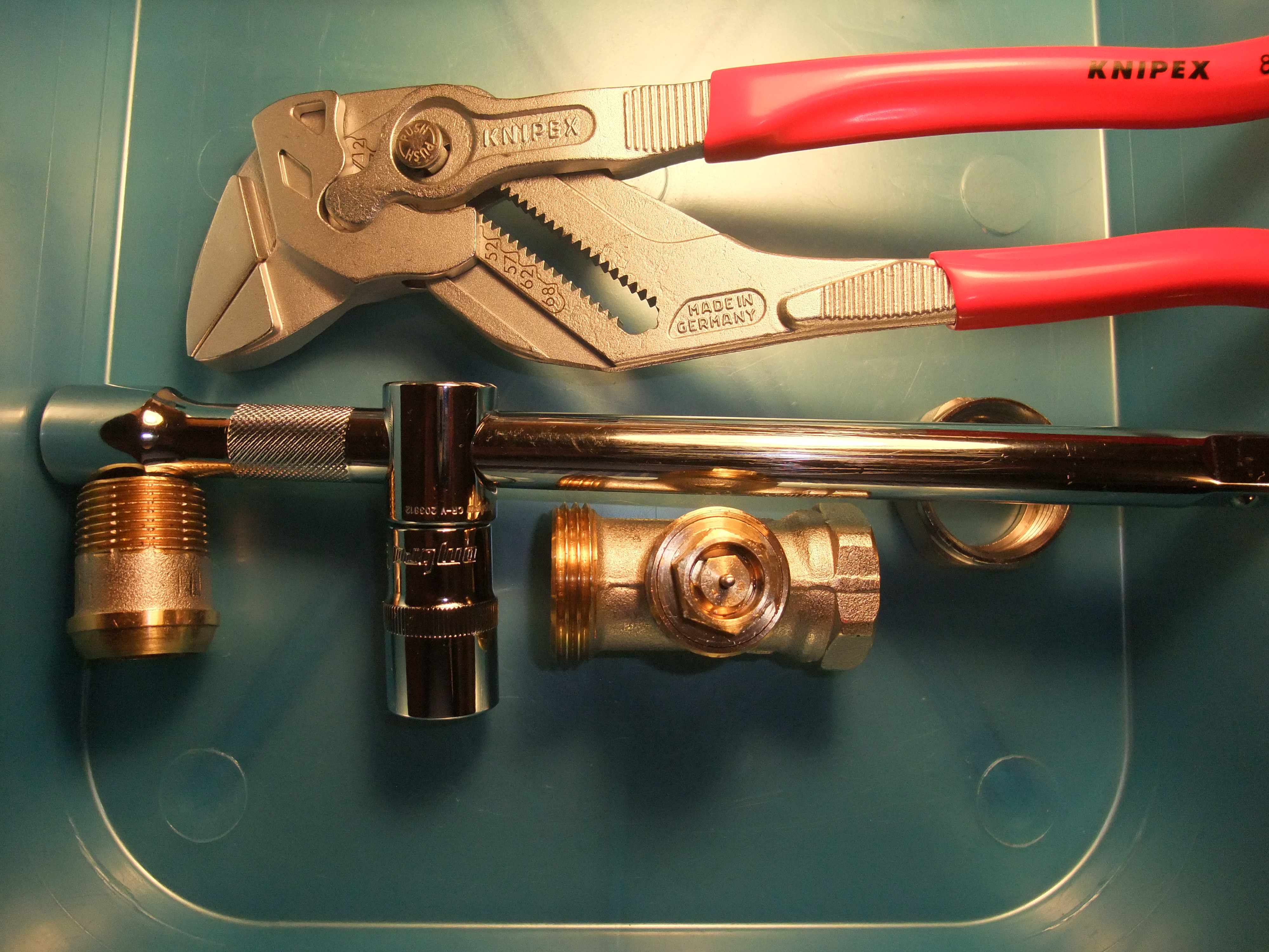 Откручивали вдвоем: один выкручивал вставку баллонным ключом GROSS 14270, второй удерживал клапан книпексом KN-86 03 300. Вставка вкручена довольно плотно, усилия нужно приложить немалые.